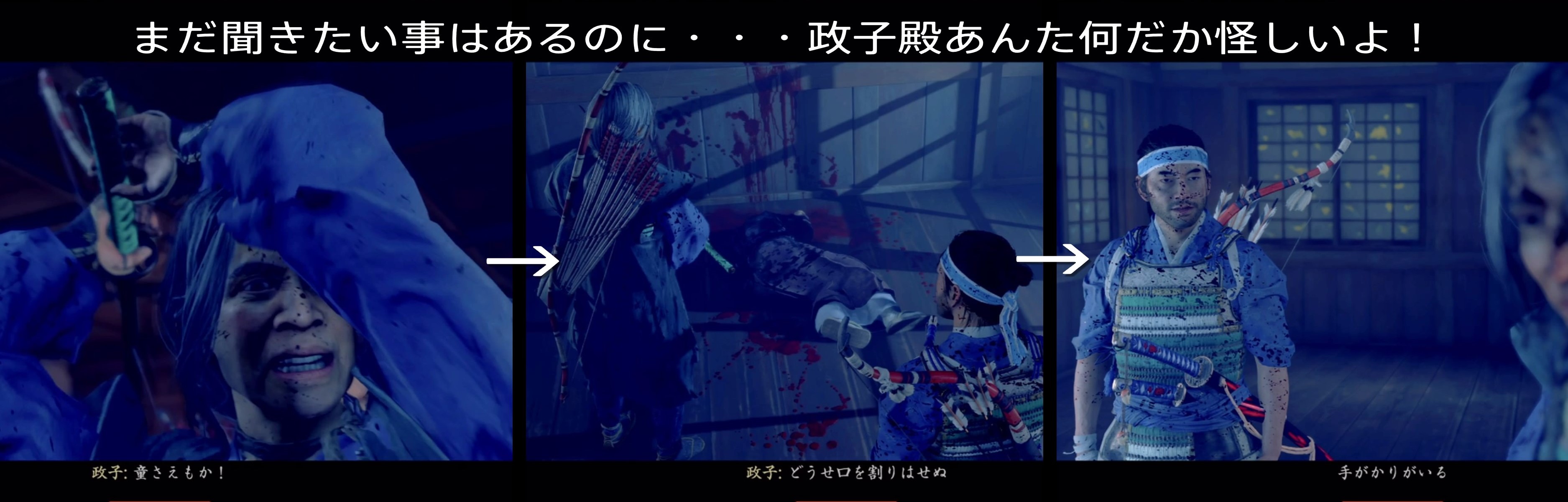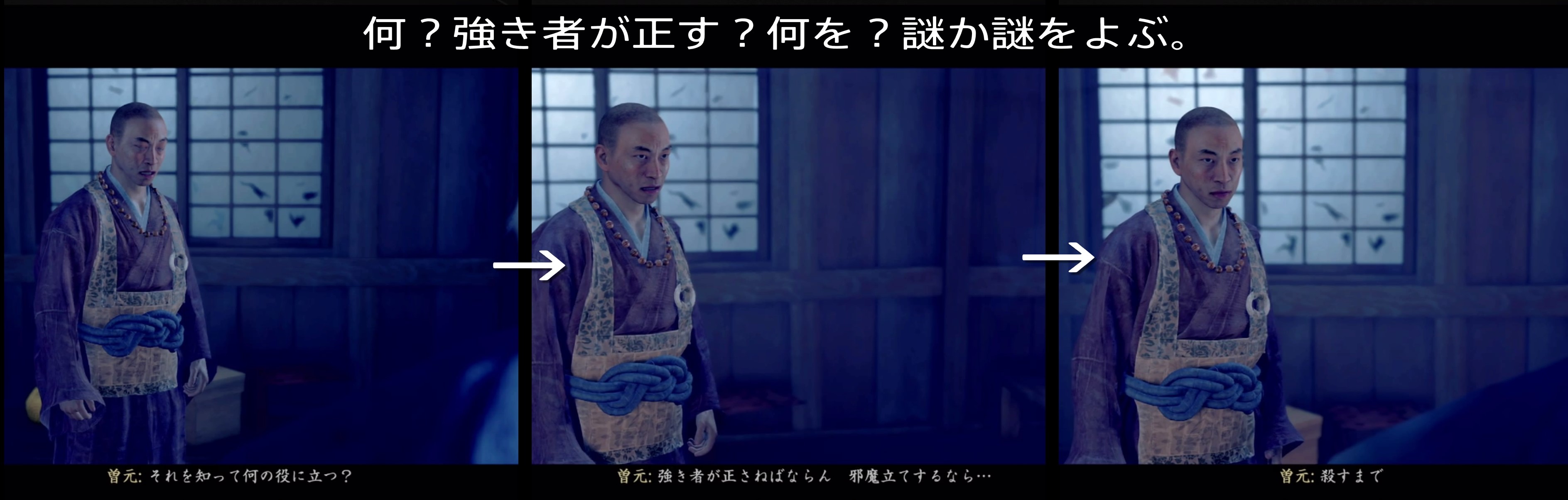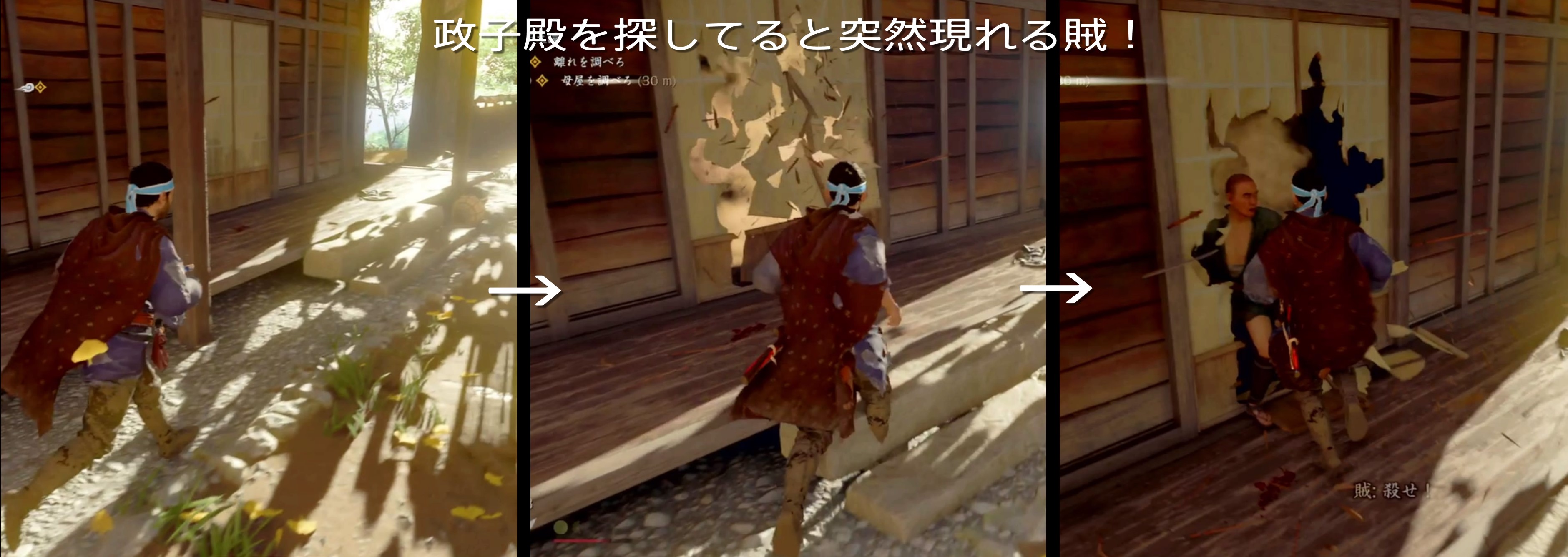 As soon as you enter the premises, you will notice blood stains. If you follow the blood stains and go to the front of the shoji, the enemy will suddenly break through the shoji and attack you.