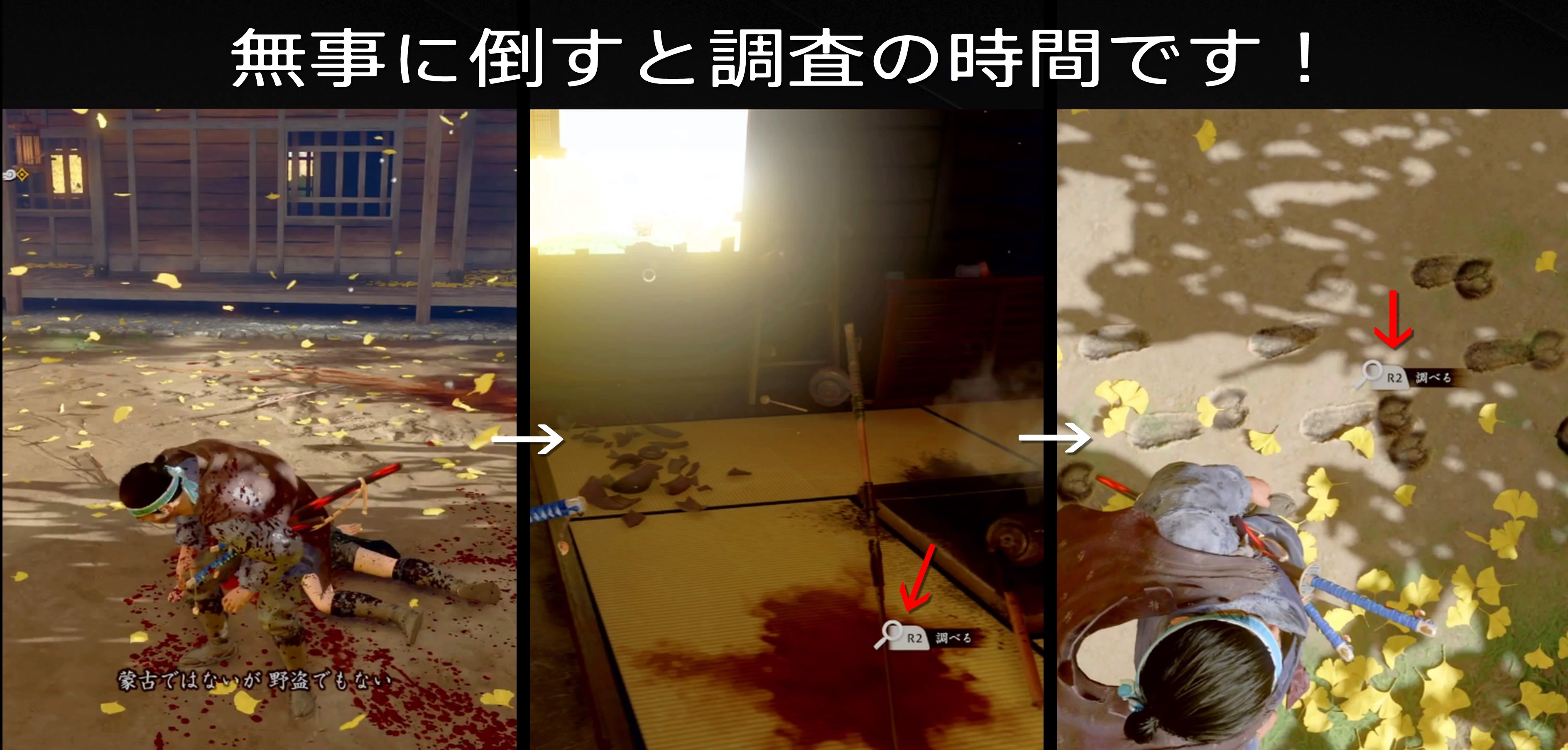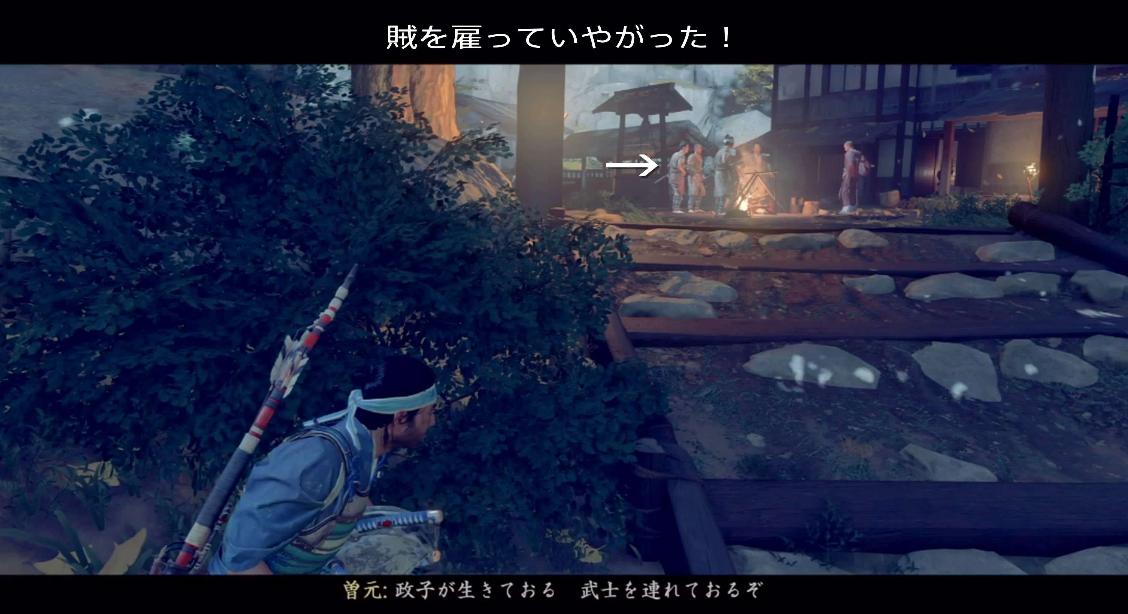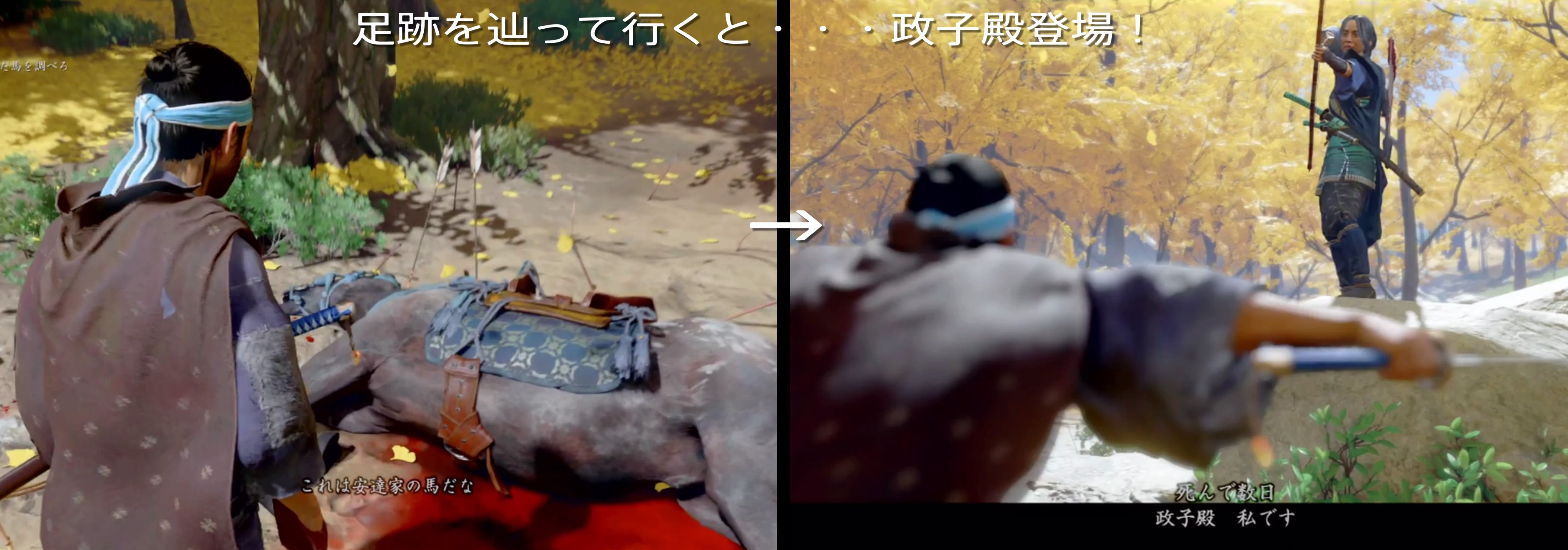 After overcoming the attack at Adachi’s house and investigating the surrounding area, there are footprints. If you follow the footsteps and walk outside the site, you will find a dead horse, and if you investigate, a single arrow will fly.