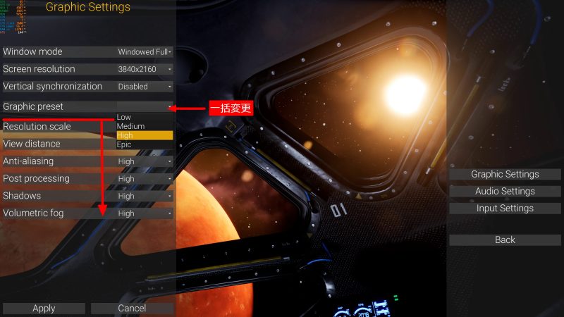 The load on the PC is determined by this setting value. Screen resolution automatically recognizes the connected monitor and allows you to select an option. Considering the load on the PC, I set the Screen resolution to the maximum value and the graphic preset to High.