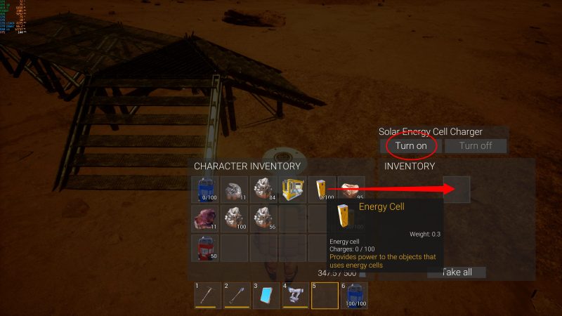Don’t forget to install the solar battery charger you got. Set this in an empty place of the hot bar, and switch the hot bar with the corresponding key to install it.