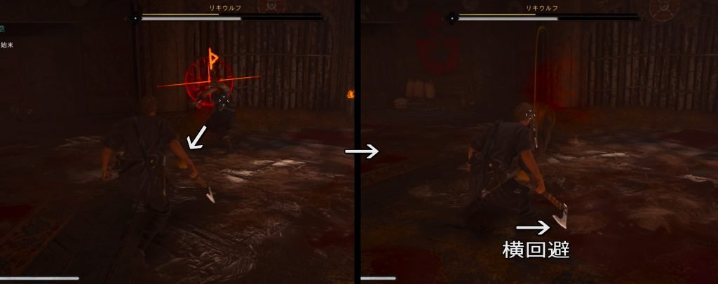 二刀流に変わると2連撃が主体となります。 プレイヤー側が攻撃モーションに入ってから黄サインが発生しても、すぐに回避ボタンを押せば意外とかわすことが可能な技です。