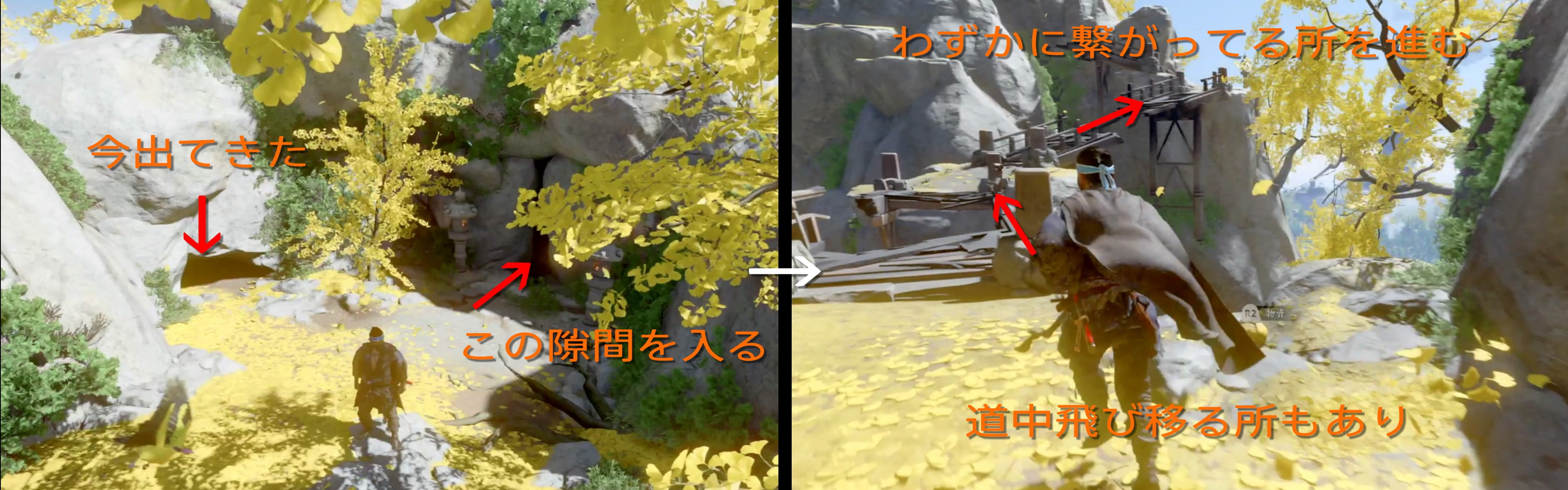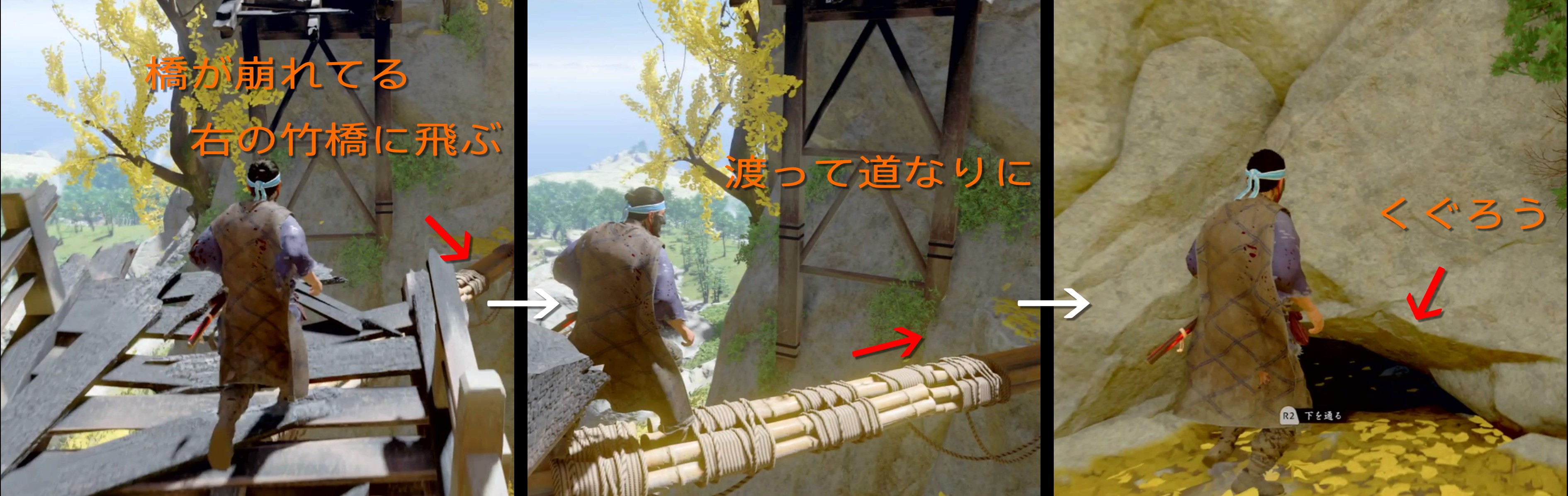 進んで行くと橋が崩れてます。 でも右に竹橋が見えます😊 こちらに飛び移り進みましょう! 進んでいくと小さなトンネルが!