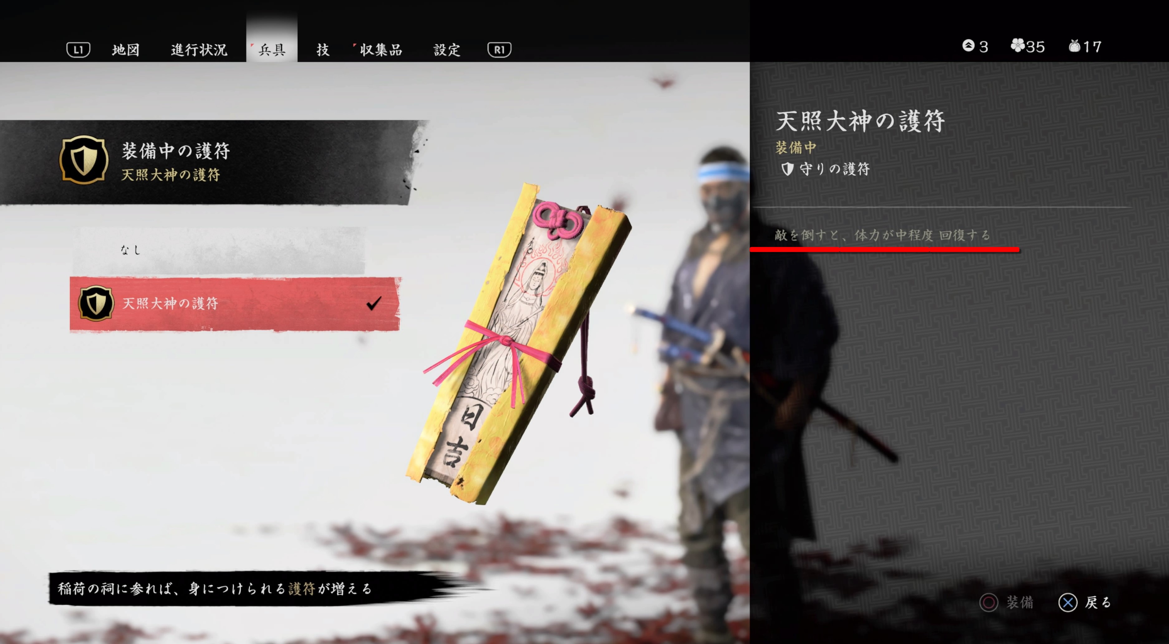 入手できる護符は【天照大神の護符】です。 効果は敵を倒すと、体力が中程度回復する! ないよりは、あった方が良いですね。😅