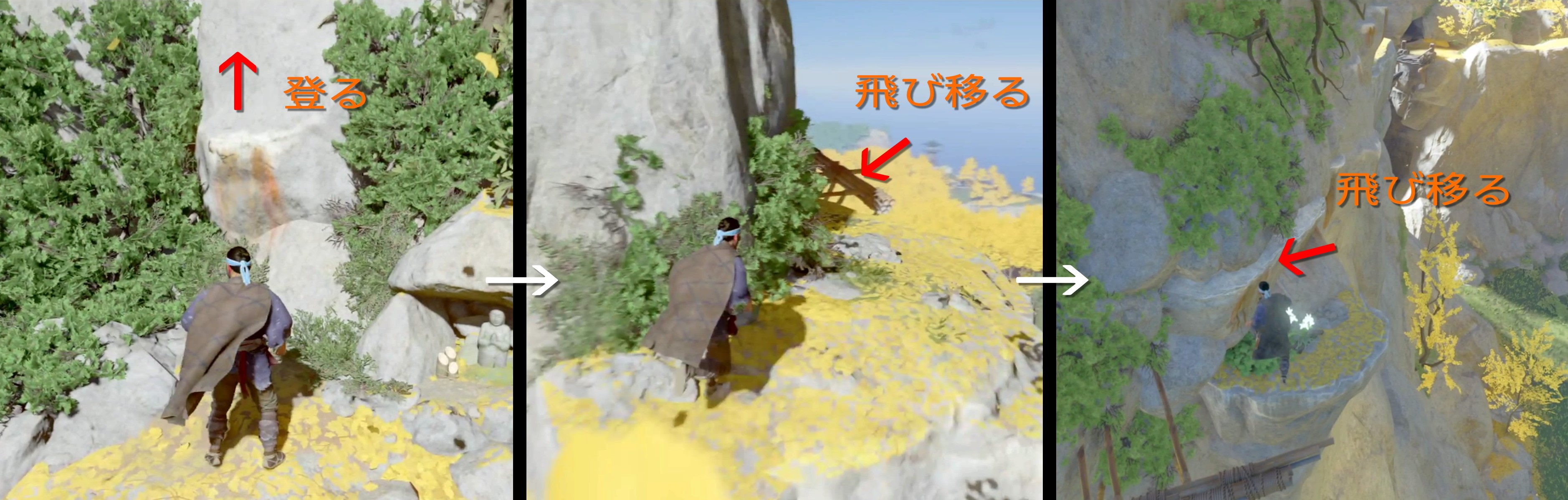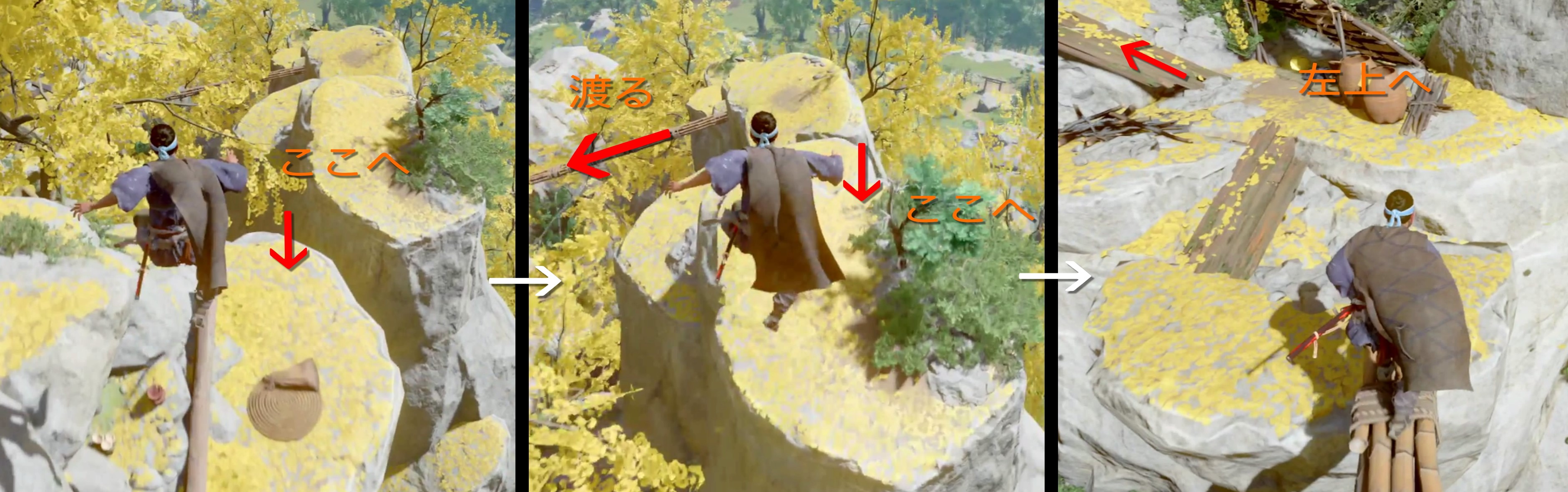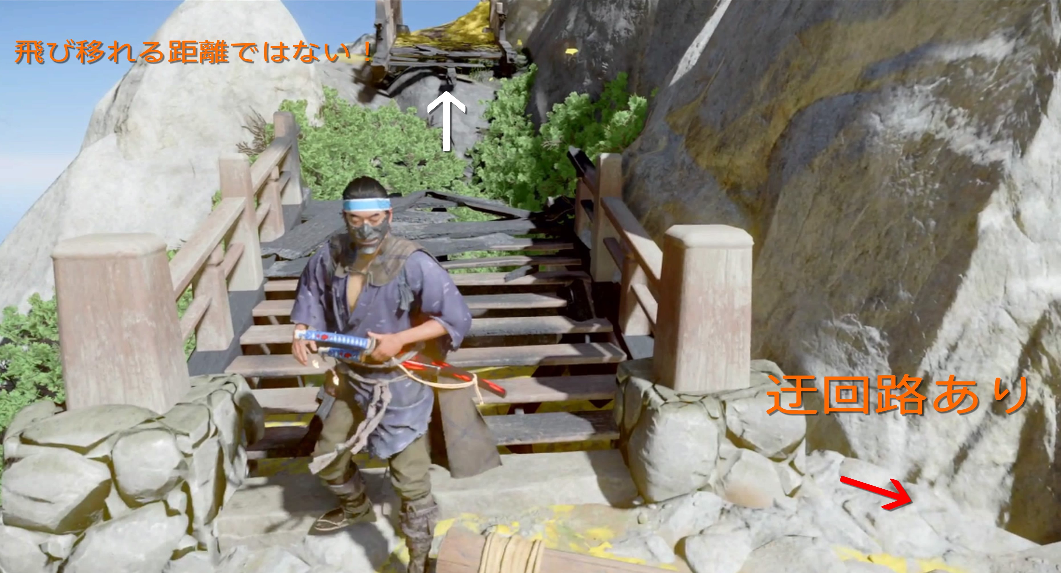 冷静に周辺をよく見ると、迂回できそうな経路を橋の手前右側に発見しました。 落下死しそうな高さですが、他のゲームでは無理かなぁと思えるところでも、このゲームでは意外と飛び移れる程ガバガバなところがあります。