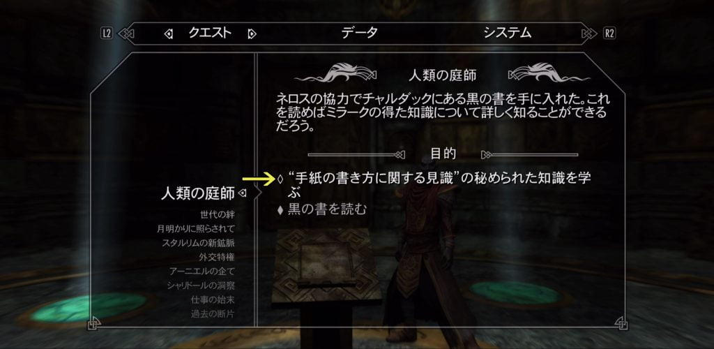 クエスト「人類の庭師」進行中の「手紙の書き方に関する見識」に差し掛かった時、事件は発生しました。 ミラークを倒すまでのクエスト関連では、「黒の書」を読み黒の書の中の世界アポクリファで展開される行程が幾つか存在します。