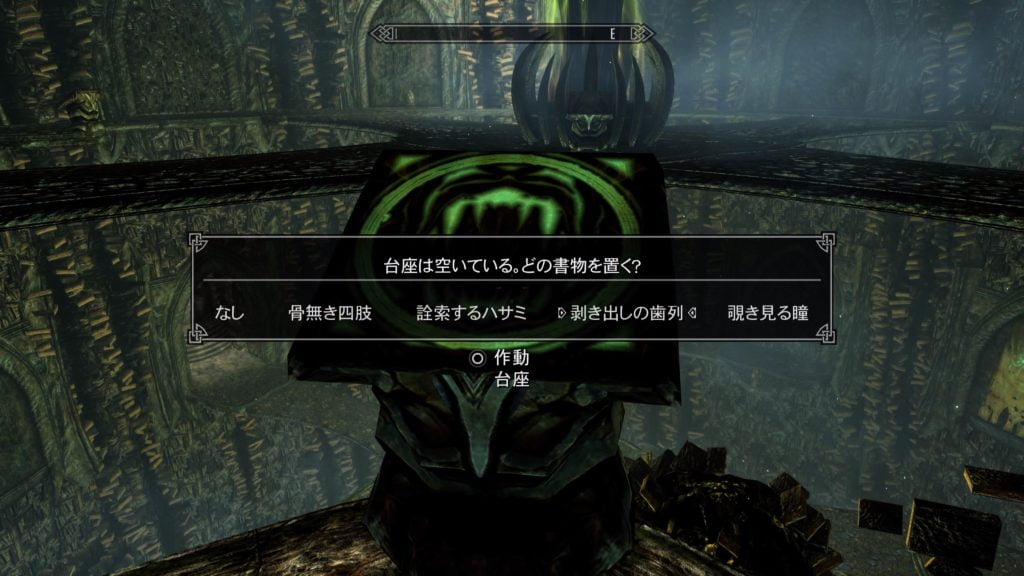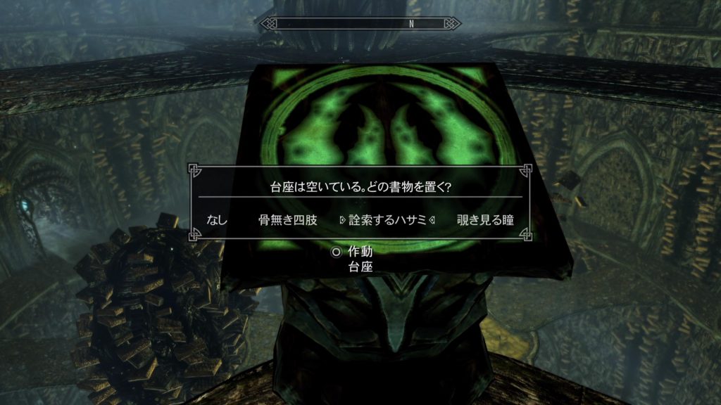設置する台座には、異なった図柄が描かれています。 この図柄に対応する書を、設置しなくてはならない訳です。 4冊の書にはキーワードがあり、四肢、ハサミ、歯列、瞳がそれですので、台座の図柄から連想される書を設置して行きます。