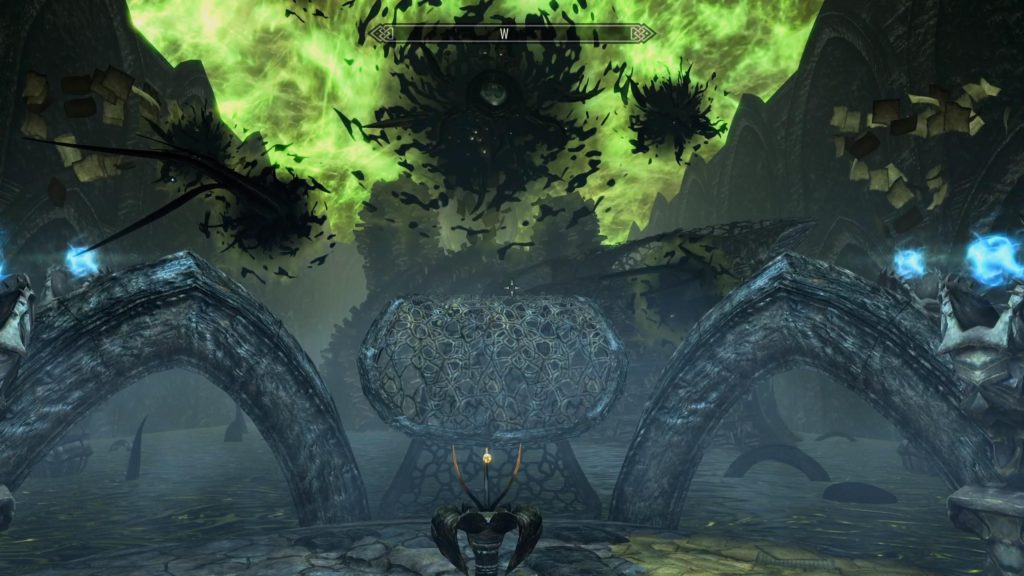 黒の書:手紙の書き方に関する見識を読み、侵入したアポクリファではハルメアス・モラからシャウト「服従」の2番目の言葉「精神」を修得します。 そして、その場にある書物からシャウトを強化する力を、3つの中から1つ選び獲得します。