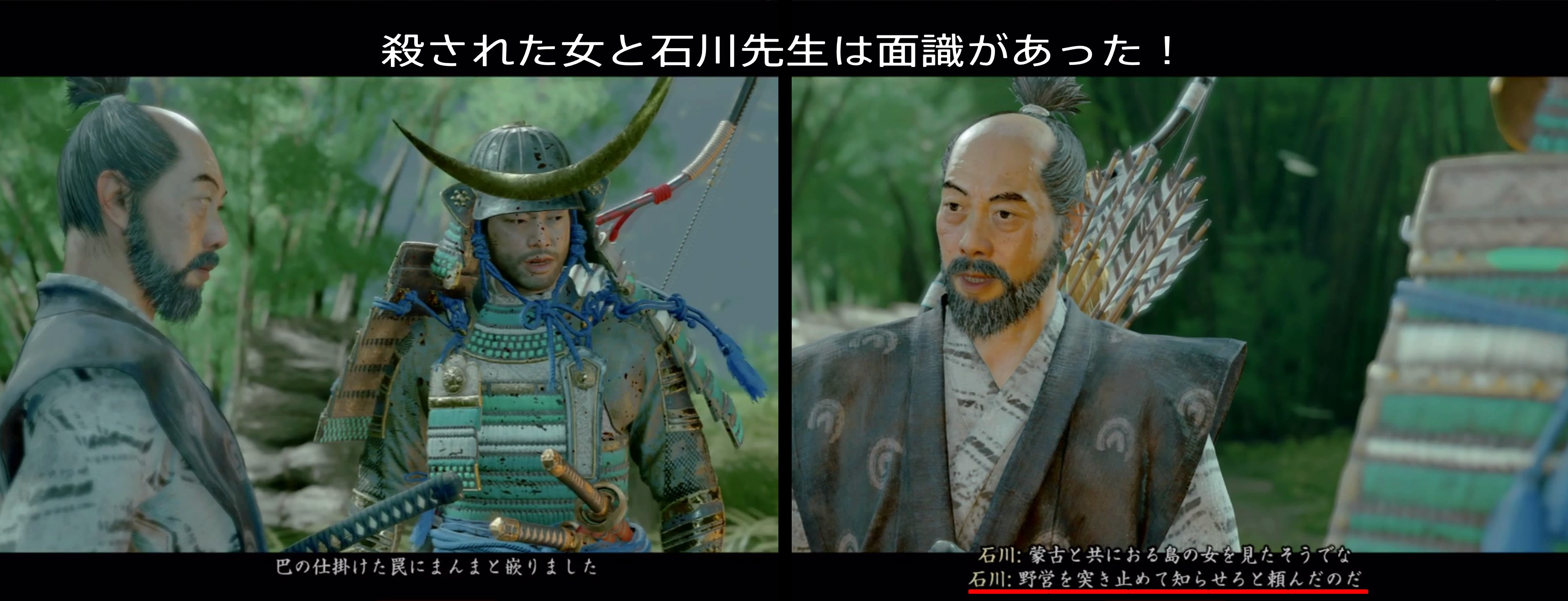 全ての蒙古兵を倒し石川の元に駆けよると、再びムービーです。 なんと殺された女は石川先生と面識があり、野営を突き止めて知らせろと指示していたようだ。