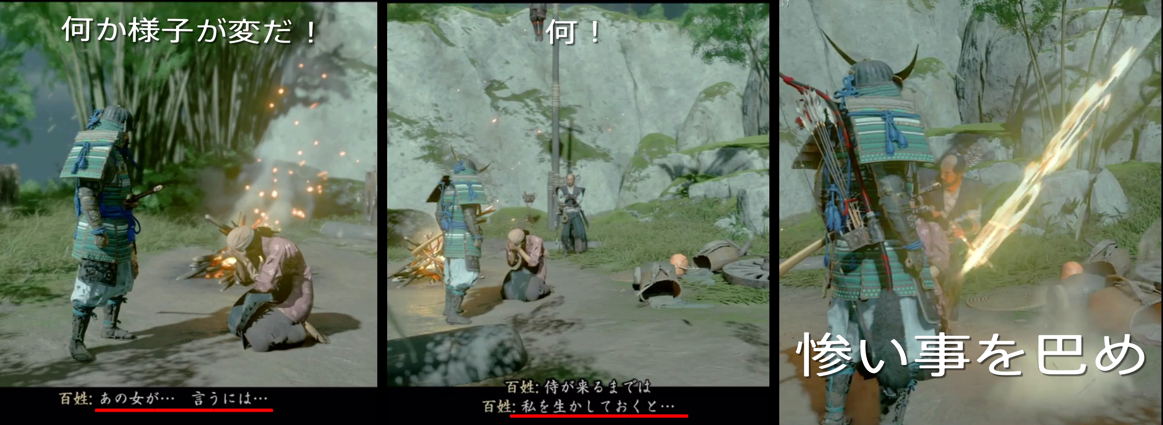 縄をほどくと女から意味深な発言が。 侍が来るまでは生かしておくと! その後、一本の火矢により女は殺されます。
