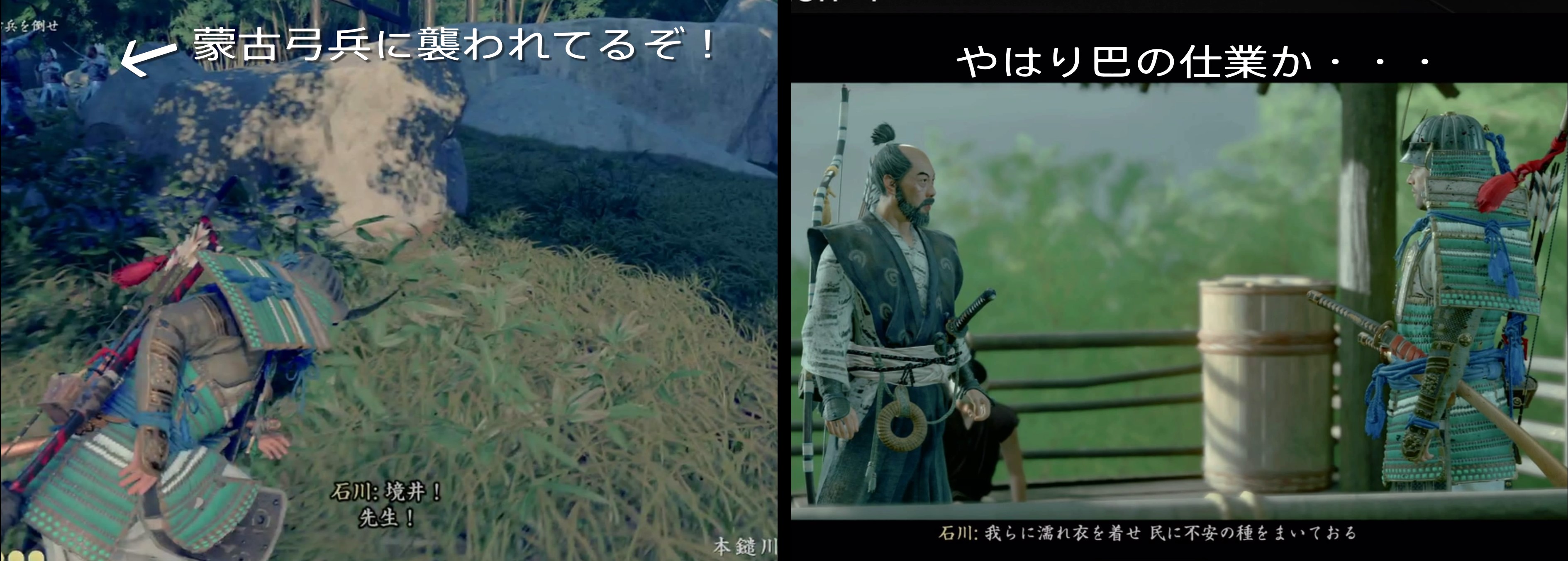 百姓を後目に先に進むと、石川が蒙古兵に襲われています。 急いで加勢しましょう!石川曰く、どうやら巴が我々に濡れ衣を着せようと民に噂を広めてるようだ。