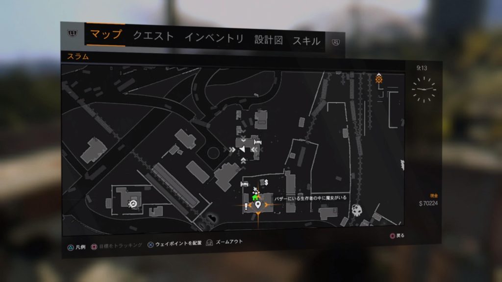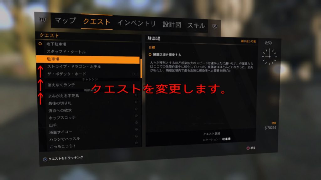 少し試してみましょう。 現在はスラムの地下駐車場前に居ます。 この場所でクエストを旧市街クエストの駐車場に切り替え、ゲームを終了します。