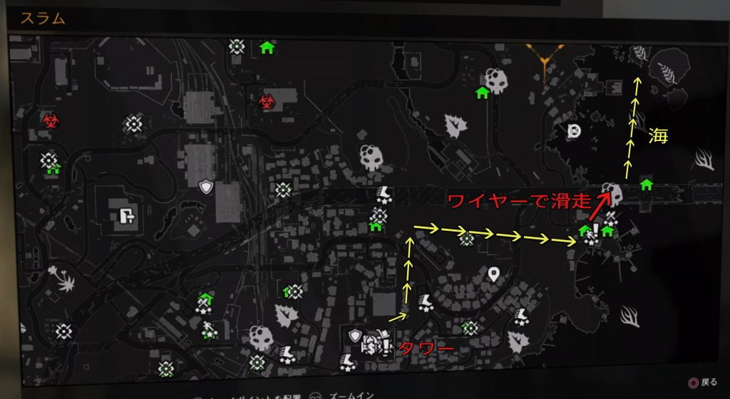 タワーの北側から出発し、安全区域の電波塔を経由して海に飛び込み、泳いで目的エリアに向かう方法です。