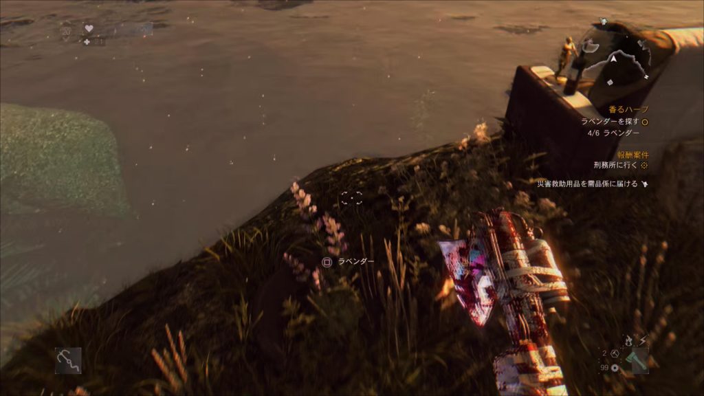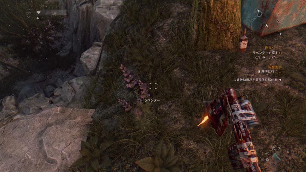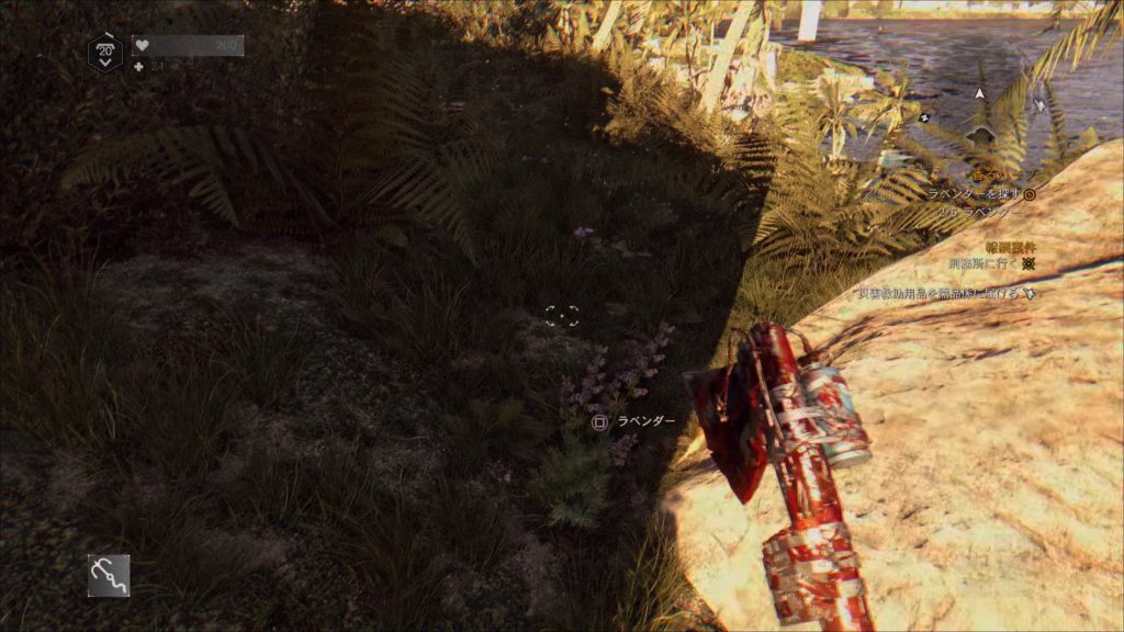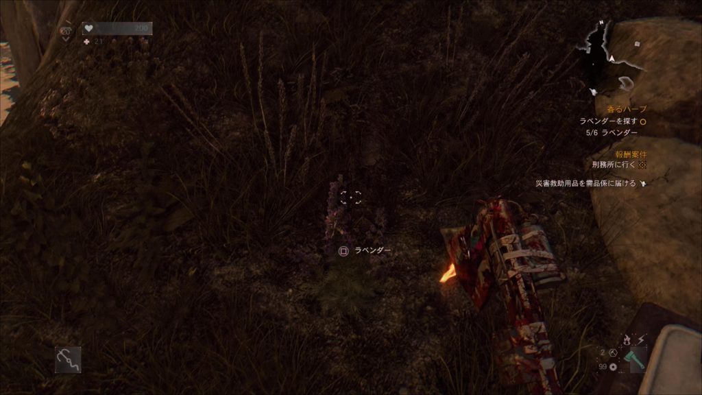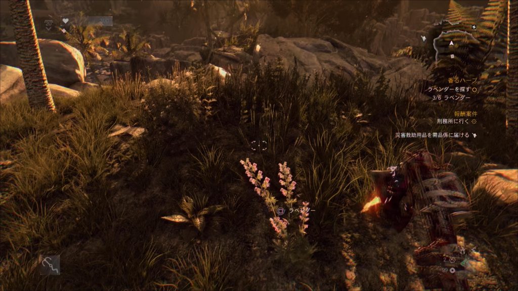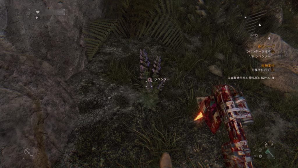 移動には「フック」があると便利です。 意外と発見しづらいラベンダーを6本採取するには、生息場所の両端を探すのが良いでしょう。
