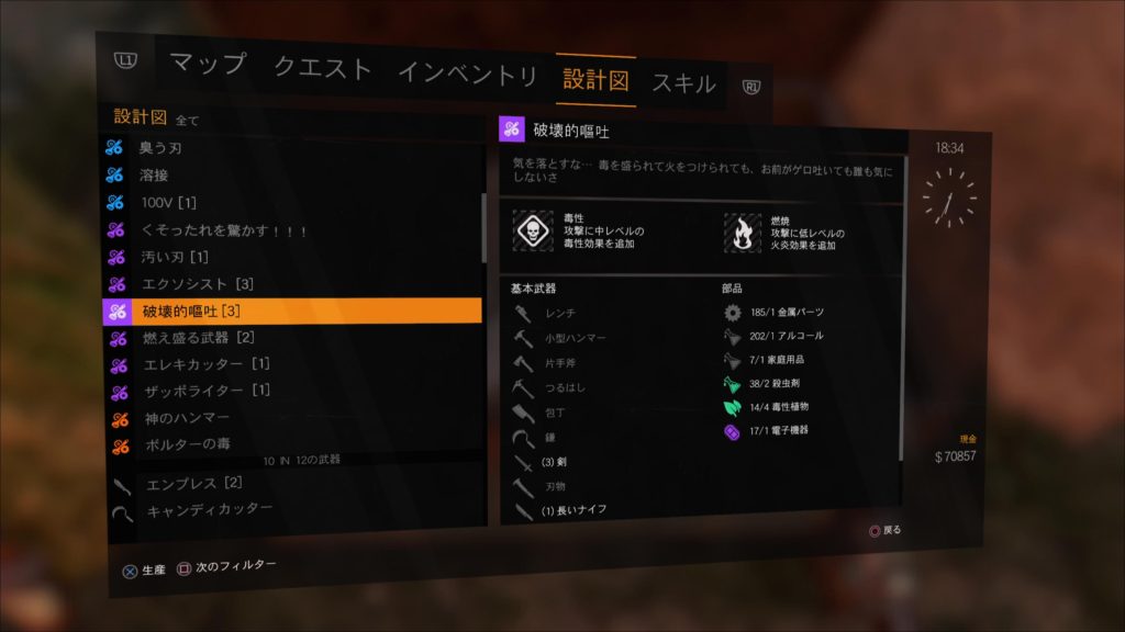 焚火横のチェストには、設計図「破壊的嘔吐」があります。