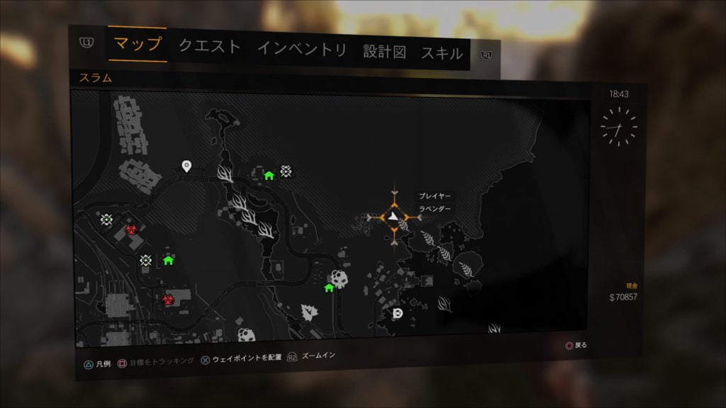 ラベンダーは、スラムマップの北東端に生息しています。 私なりに、比較的安全性の高いと思われる経路を考えてみました。 まずは、下のマップをご覧ください。