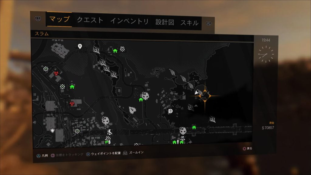 それでは、一番北にあるドラム缶焚火の場所から紹介します。 この場所へは、獣道のような上り坂を登った先にあります。 マップで確認しながら、上の画像の位置まで登って行きましょう。