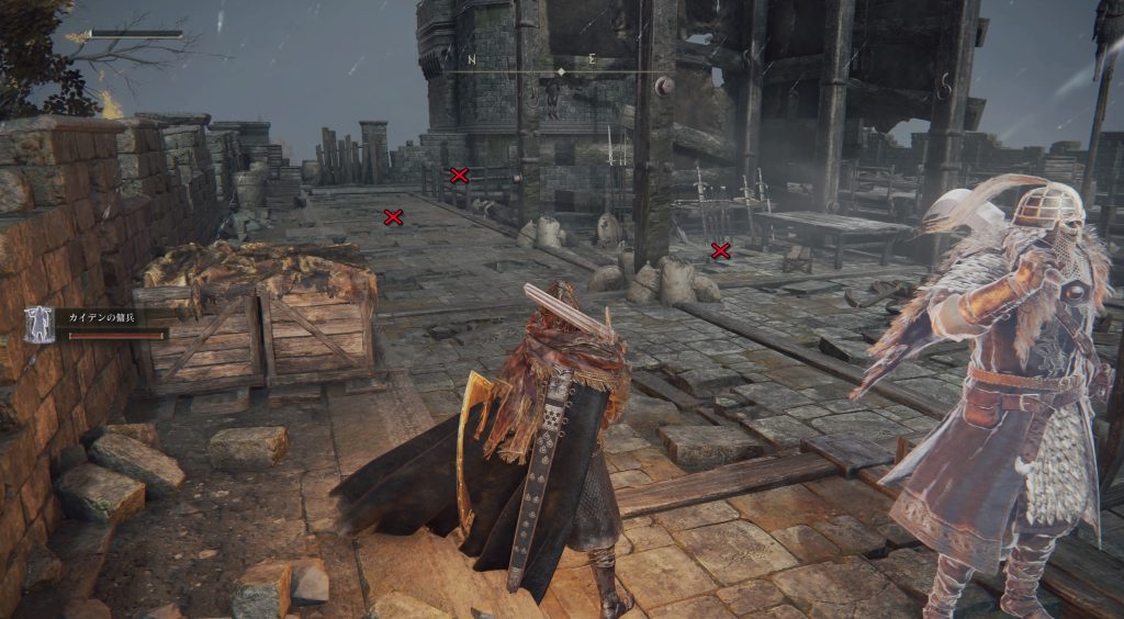 ここでは例として、絞首刑台のラダーン兵を出現させる接近方法を説明します。 絞首刑台のラダーン兵は、下の画像で説明すると✕印の位置で左の穴の方向に向いて潜んでます。