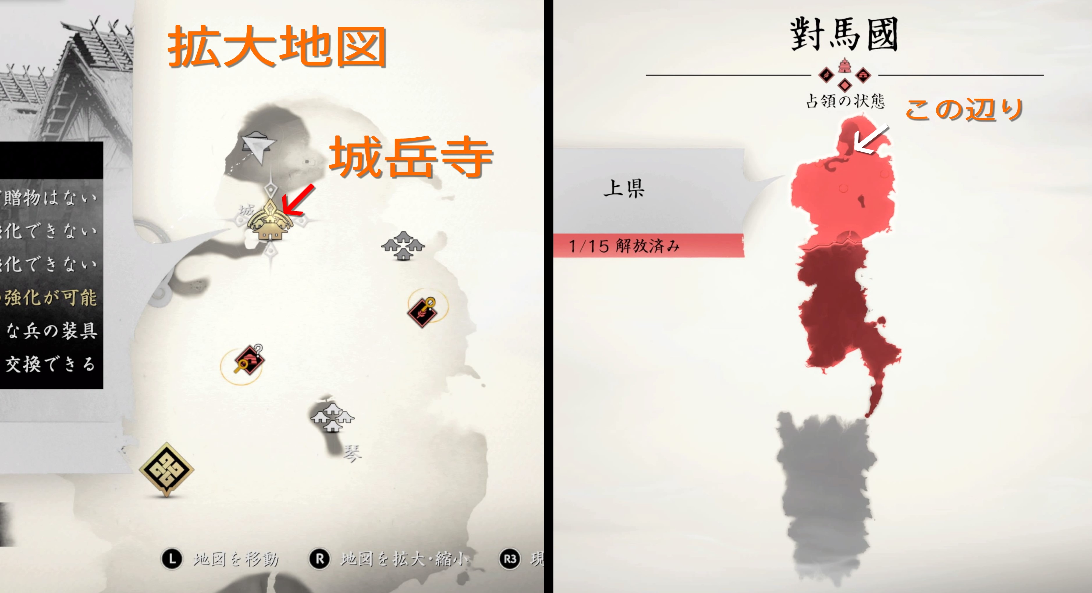 城岳寺は蒙古兵に占領されています。 仁之道を進めると【誉と灰】という物語が発生し、これをクリアすると解放されます。