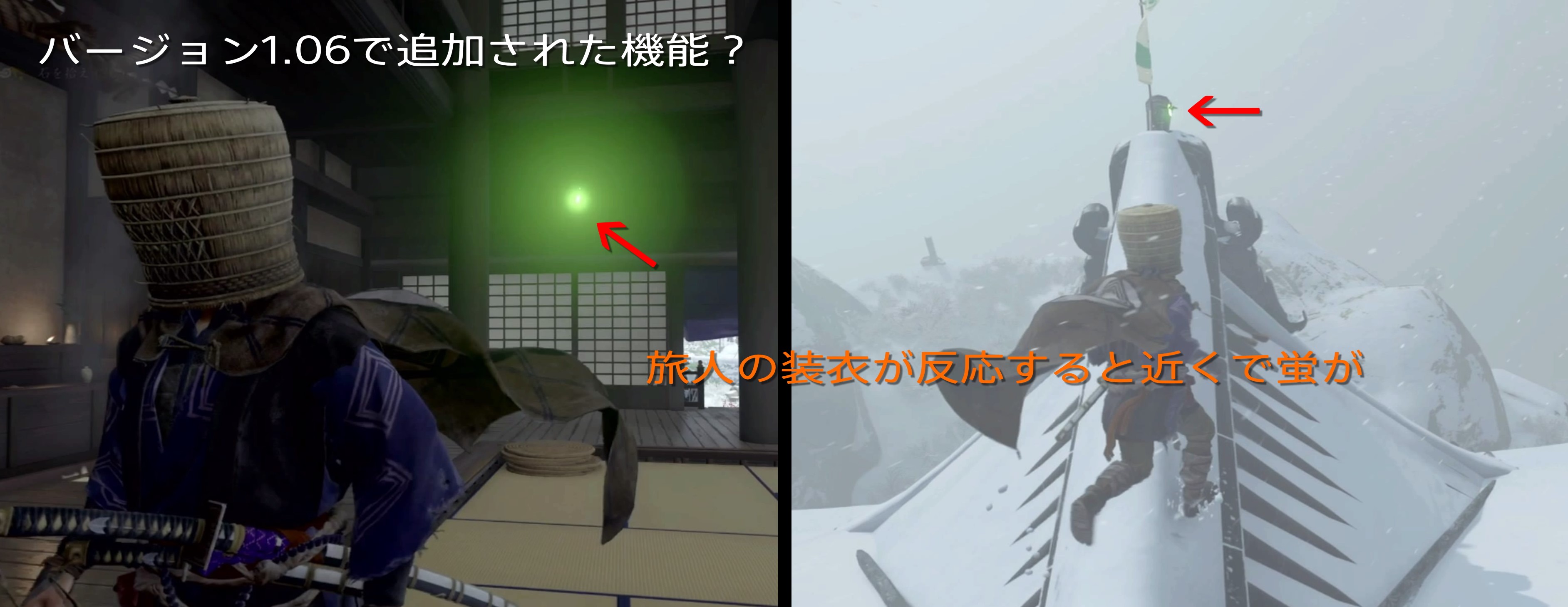 バージョン1.06で追加された機能で、旅人の装衣を装備している状態で、蛍のが飛び出してくることがあります。