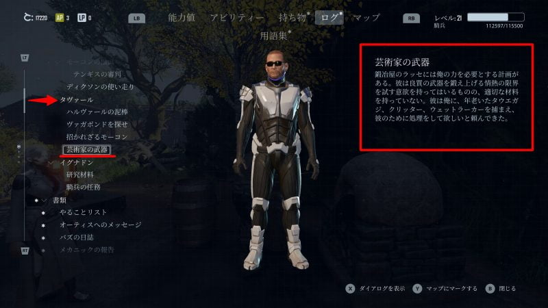 メニュー画面でログを確認すると、タヴァールカテゴリーに「芸術家の武器」があります。 これにカーソルを合わせたら、マップにマーク(画面右下表記の対応キー)することで目的地がナビゲートされます。
