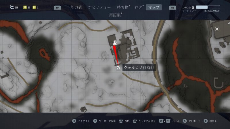 ファストトラベル地点から拠点内に入り、下の画像のように進みます。