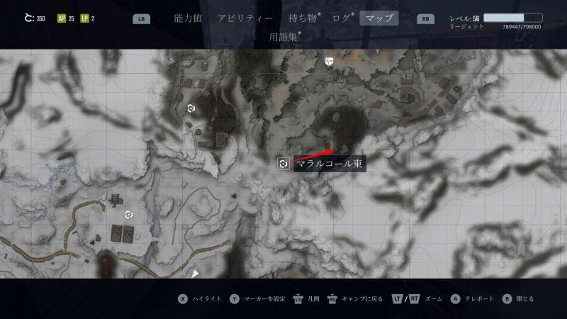 ここは少々分かりにくいので、下の拡大MAPを参照ください。 ファストトラベル地点から北西に、一段上の地形へと進んで行きます。 もちろん敵モンスターも徘徊していますので、戦闘態勢で進みましょう。