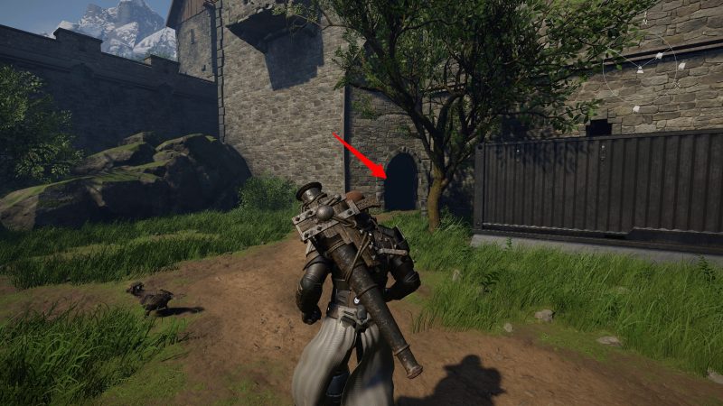 少し分かりづらいですが、下の画像を参考に進むと左の壁に赤い勢力旗がかかっている場所に辿り着きます。 その壁の逆方向(北に向かって右)に入口があるので、中へと進みましょう。