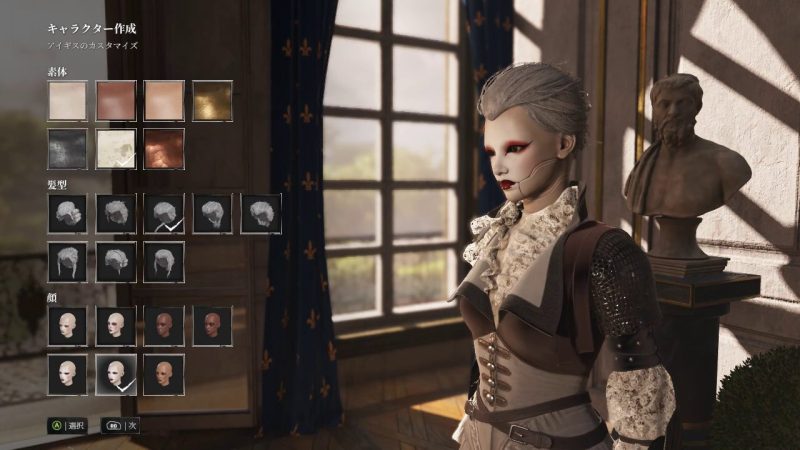 ここでオープニング映像から、プレイヤーが操るアイギスのカスタマイズに移行します。 アイギスは機械人形らしさを上手く表現しており、装備となる衣服もフランス貴族の美しさがあります。 体・髪・顔を選択肢から選んで、最も自分好みに近いものへと仕上げていきます。