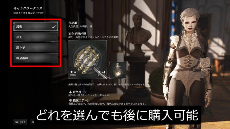 外見が終われば、次はキャラクタークラスの選択です。 ここでは扱う武器を選ぶのですが、後々ウェスタと言われる「かがり火」や「祝福」と同じような扱いの装置で購入可能です。 要するに直感で選んでOKでしょう。