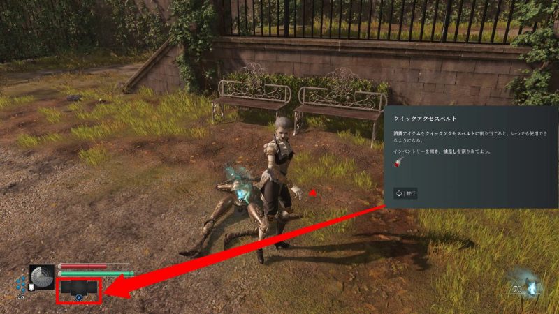 回復系アイテムや投擲アイテムなど、頻繁に使用するものはクイックアクセスベルトにセットしておきます。 十字キーで切り替え、対応ボタンで使用できます。