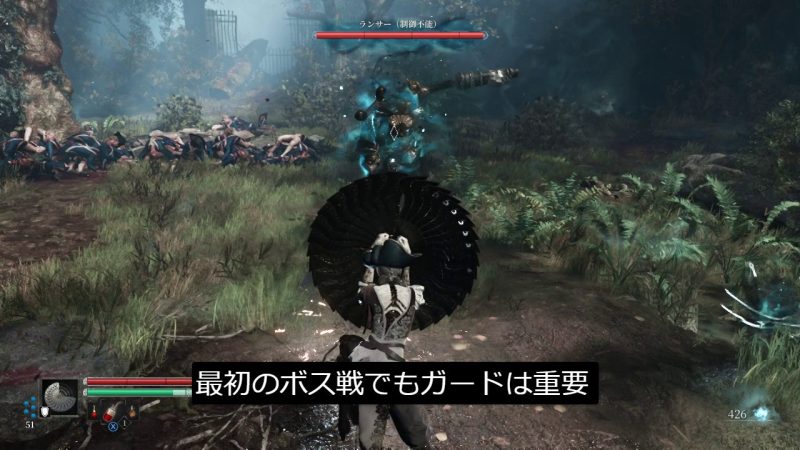 では、ガードできない武器の場合どうすれば良いかと言えば、動きを覚えてランサーの攻撃を回避してから反撃となります。 少々難易度が高くなるのも確かです。 後方に回避したのでは、反撃するにも距離が離れているので上手くダメージを与えられないことも多々。 可能な限り横回避で捌く必要があります。