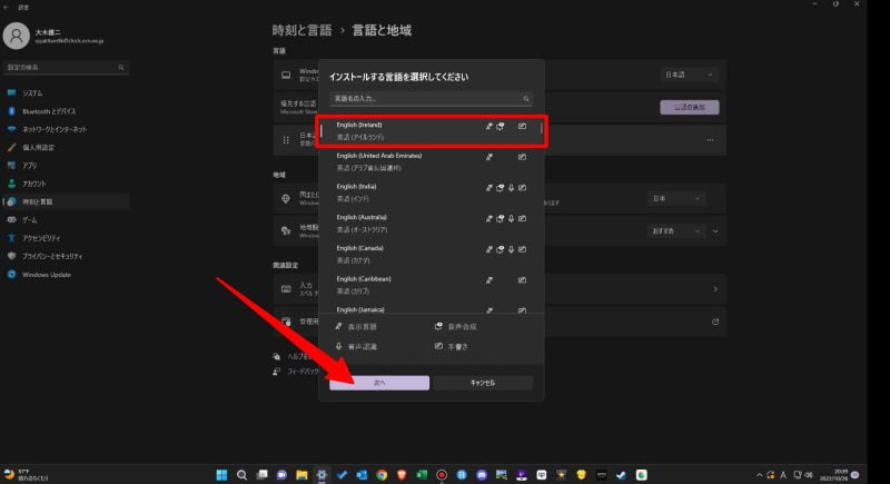 英語(アイルランド)を選択し次へを左クリック