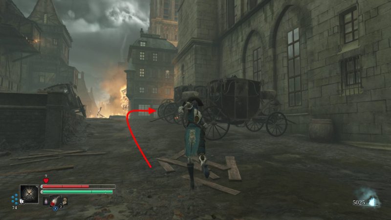 対岸では右側にテラスから侵入できる建物があり、壊れた馬車の上からジャンプで移動します。