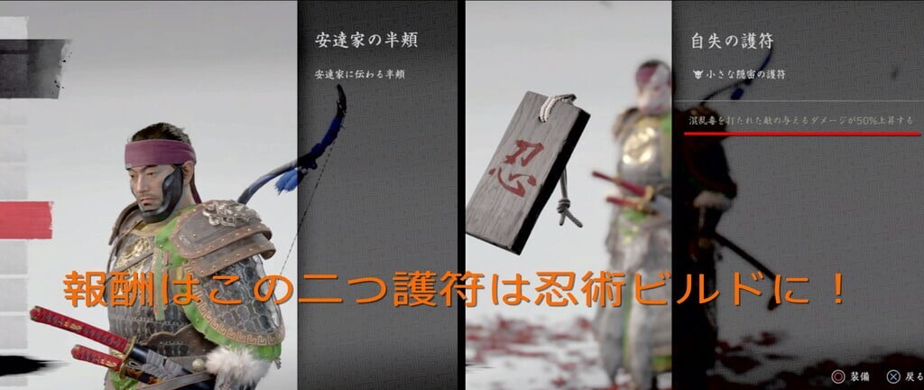 今回の報酬はこの二つ。 護符は忍びビルドにつかっても良さそうですね!