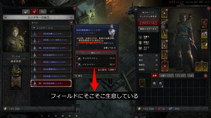 つまり、錬金術師がいる街でエリクサーをクラフトし、ダンジョンなど頻繁に戦闘が起こる場所に入る時には、エリクサーを使用した状態で挑むことを習慣づけすると良いでしょう。