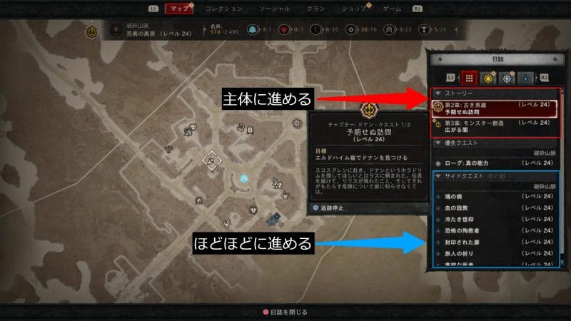 ディアブロ4では、没入感を向上させるようなストーリーが数多く存在します。 クエストはメインとなるストーリーと優先クエスト、そして!マーク付きNPCと会話することで発生するサイドクエストから構成されています。