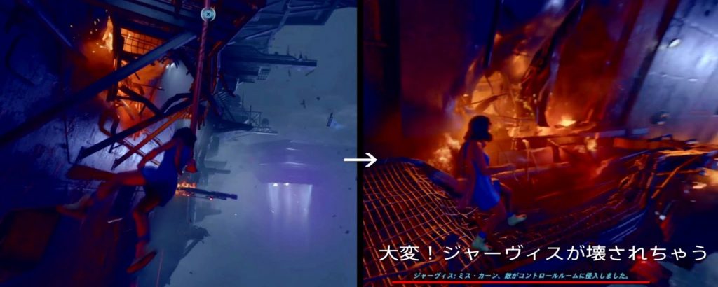 トニー(アイアンマン)が立ち去った目の前の出っ張りを掴んで移動します。