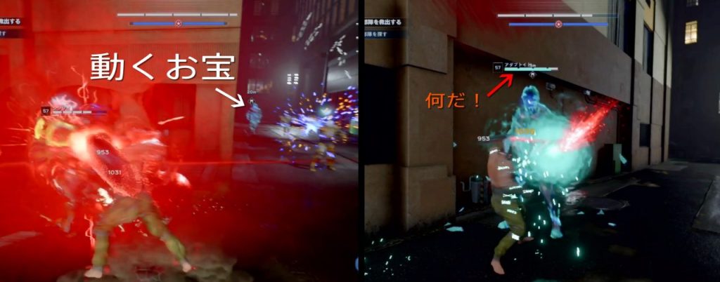 二階のオブジェクト二つを攻撃したら、すぐさま一階へ降りオブジェクト二つを攻撃します。ゆっくりしすぎるとリセットされますので、慌てる必要はないですが先に位置をチェックしておきましょう。
