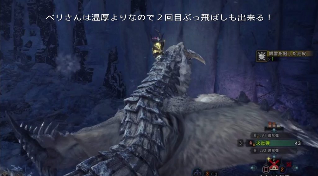 ベリオロスの氷ブレスは地面を凍結させるので、ここに触れると拘束され、待っていたかのごとく強烈な一撃を打ち込んできますので要注意です!