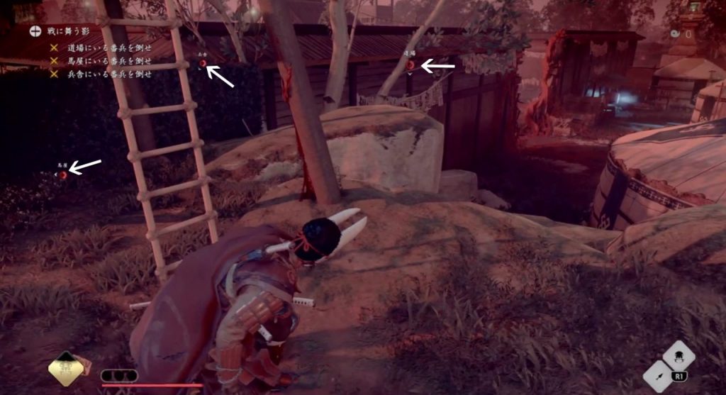 スタート時の気の値は5に対し、最初のステージ推奨値は15です(;´・ω・)斬られるとライフはみるみる減りますし、敵は硬いし・・・闇討と弓を駆使して1体1体倒すのが良いでしょう。