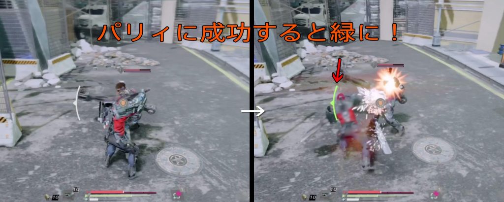 敵が攻撃を仕掛けてくる方向がナビされるインプラントを装備すると、パリィに役立ちます。 成功するとナビの色が緑に変化しますので、メッドベイ付近で練習するのにいいですね!