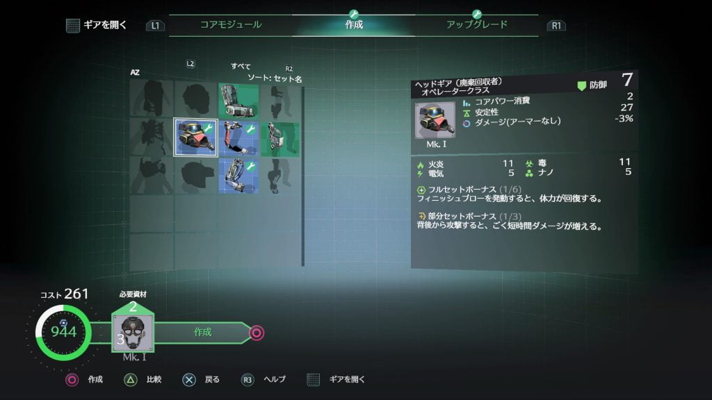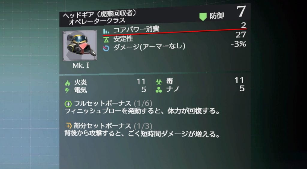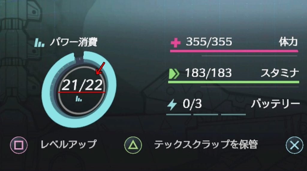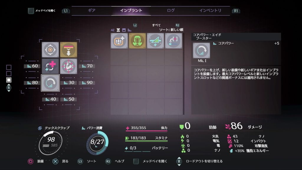 パワー消費とは、コストのようなものですね。 装備するギアやインプラントには固有のコアパワー値が設定されており、キャラ最大パワー消費値までしか装備することが出来ません。