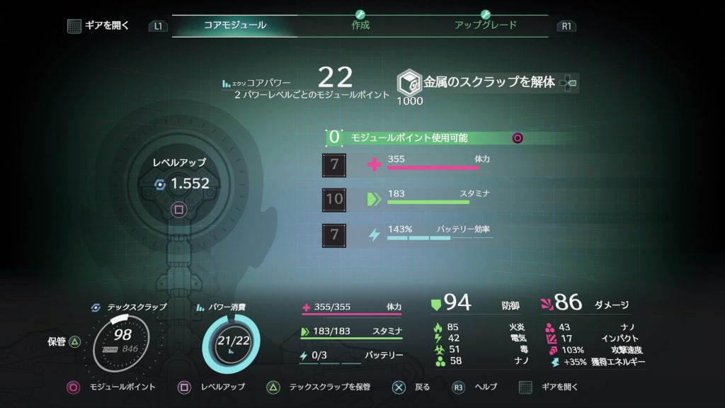 - コアモジュール:キャラのレベルアップとステータス(体力・スタミナ・バッテリー効率)の振り分けを行う。