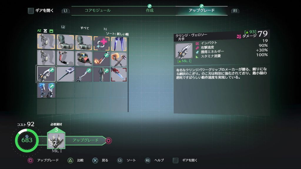 - アップグレード:武器・防具のアップグレードを行う。