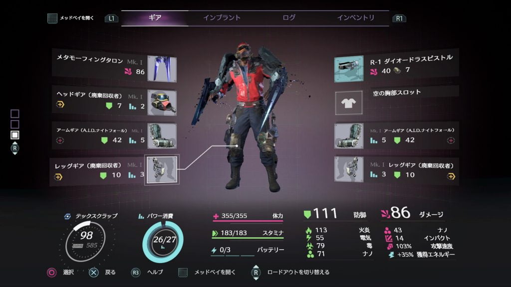 タッチパッドを押すことで、ギア画面とメッドベイ画面が切り替わります。 レベルアップとギア・インプラントの組み合わせでキャラを強化していくようですね!