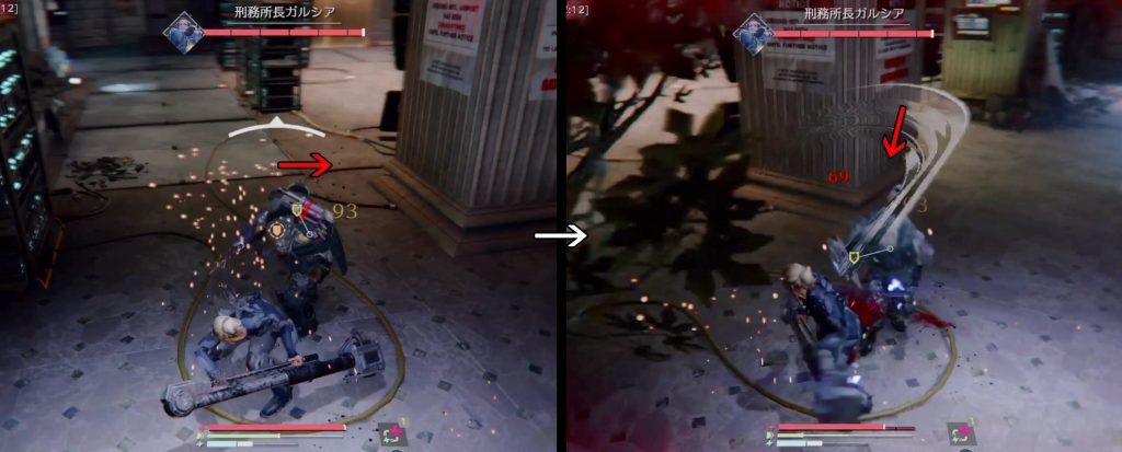 回転2連攻撃:後ろを向きだすと回転攻撃です。1回転目をかわしても2回転目がきますので、ニトロを中心に後退しながら円を描くように移動するのが良いかと!