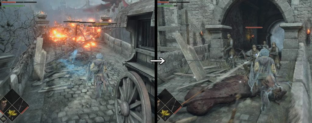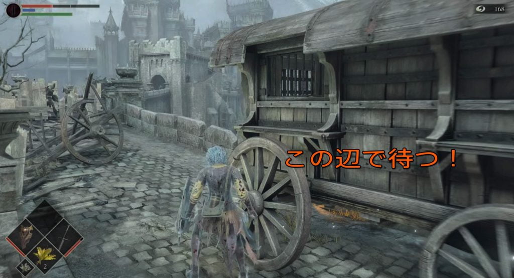壁上から階段で下りて、右側(進行方向)にはボーレタリア城門に居た盗品商、左側(ボーレタリア城門方向)には助けを求めるNPCが居ます!