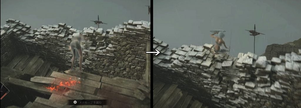 いきなりガコッと音が・・・フロムの罠ですが、ガードせずとも左にLスティックを倒し続ければ回避できるでぇ~