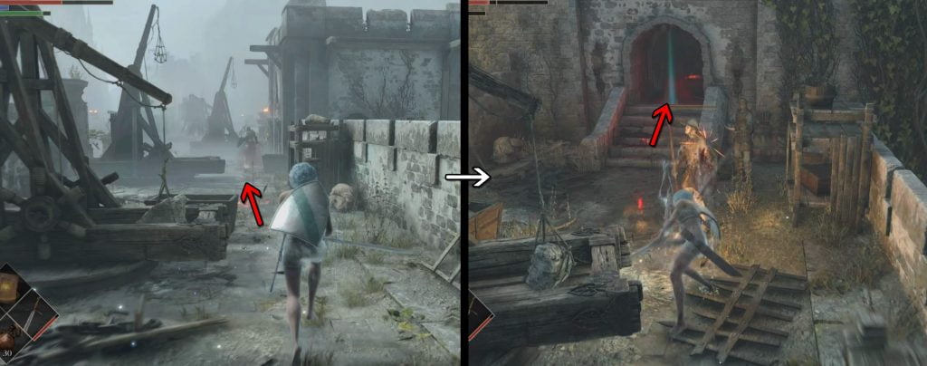 入口の先は5体の炎を振り回すモブがいますので、出の早い武器で応戦しながら進みましょう! 最上階まで上って外に出ると投石機のような装置が並ぶ塀の上に出ます。 先ほど倒した甲冑モブから直進で、剣持ち・ボウガン持ち・槍持ち・ボウガン持ちの順にモブが配置されています。