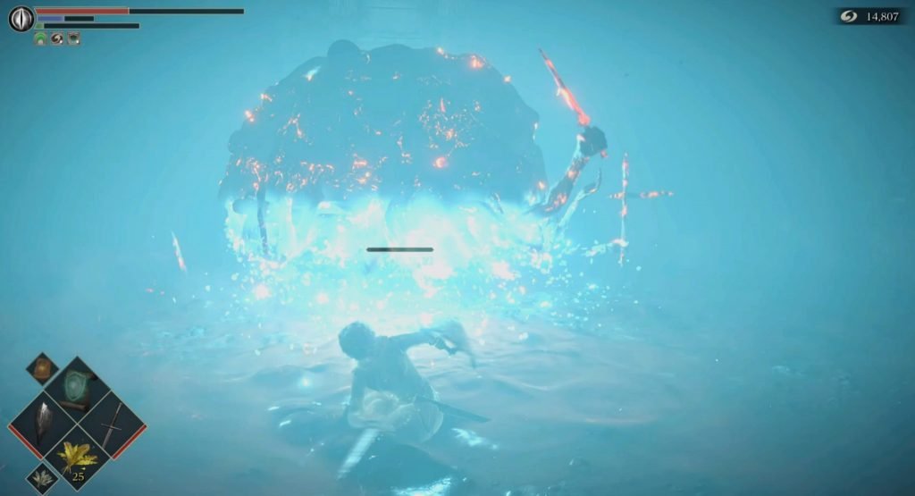| 1.中距離から遠距離を維持して魔法攻撃を誘発します。 モーションとしては下の部分が薄っすらと青く光ります。 この発光が強くなり魔法発動となる訳です。 |